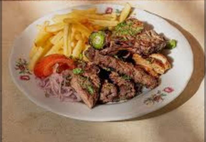 خمسة أنواع من اللحوم مع البطاطس المقلية والسلطة.